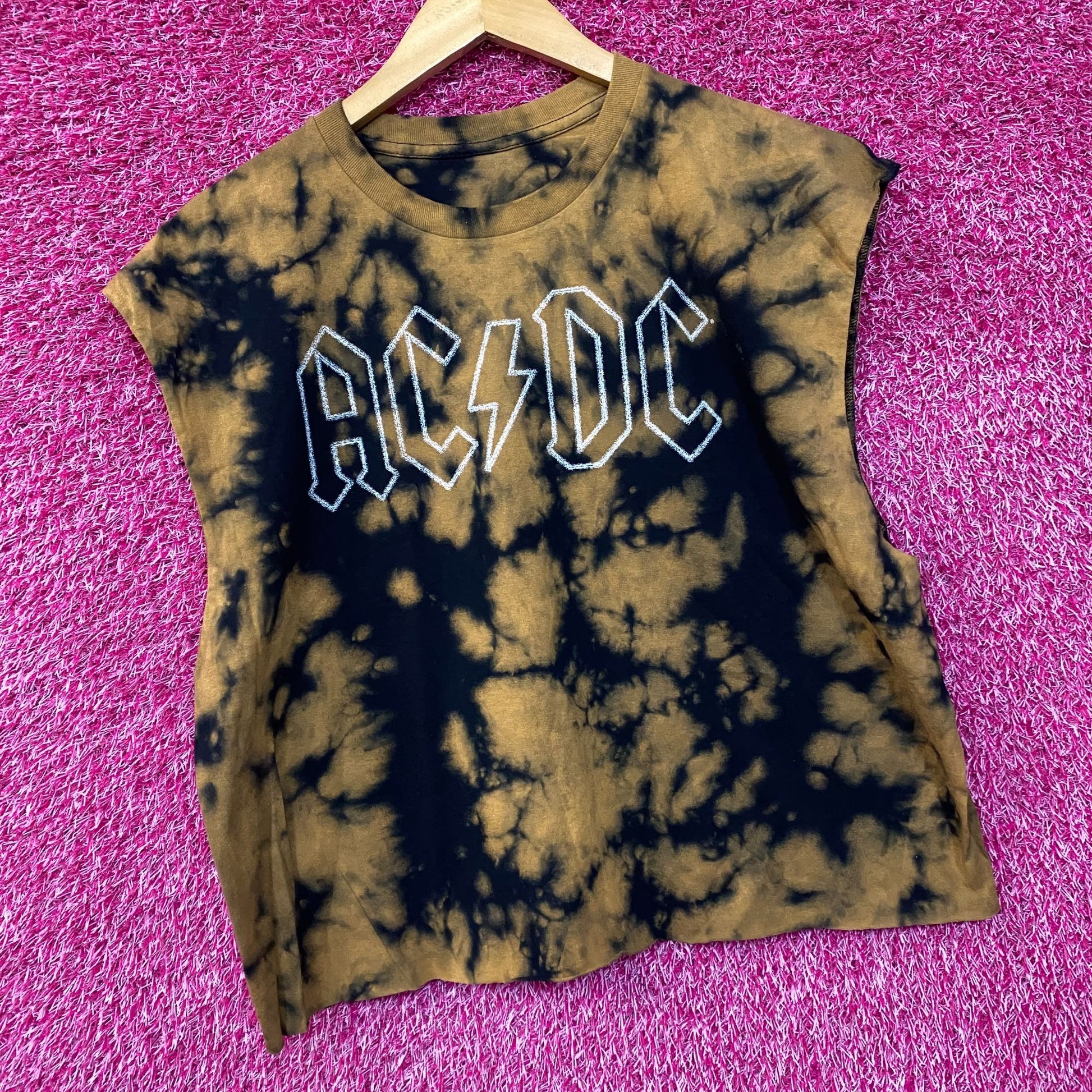 AC/DC Tie Dye Rock Band Sleeveless Croptop Large. Generally measures 23 inches pit to pit and 23 inches long. Amazing tie dye design sleeveless croptop, perfect for Acdc fans. New never worn in great condition.