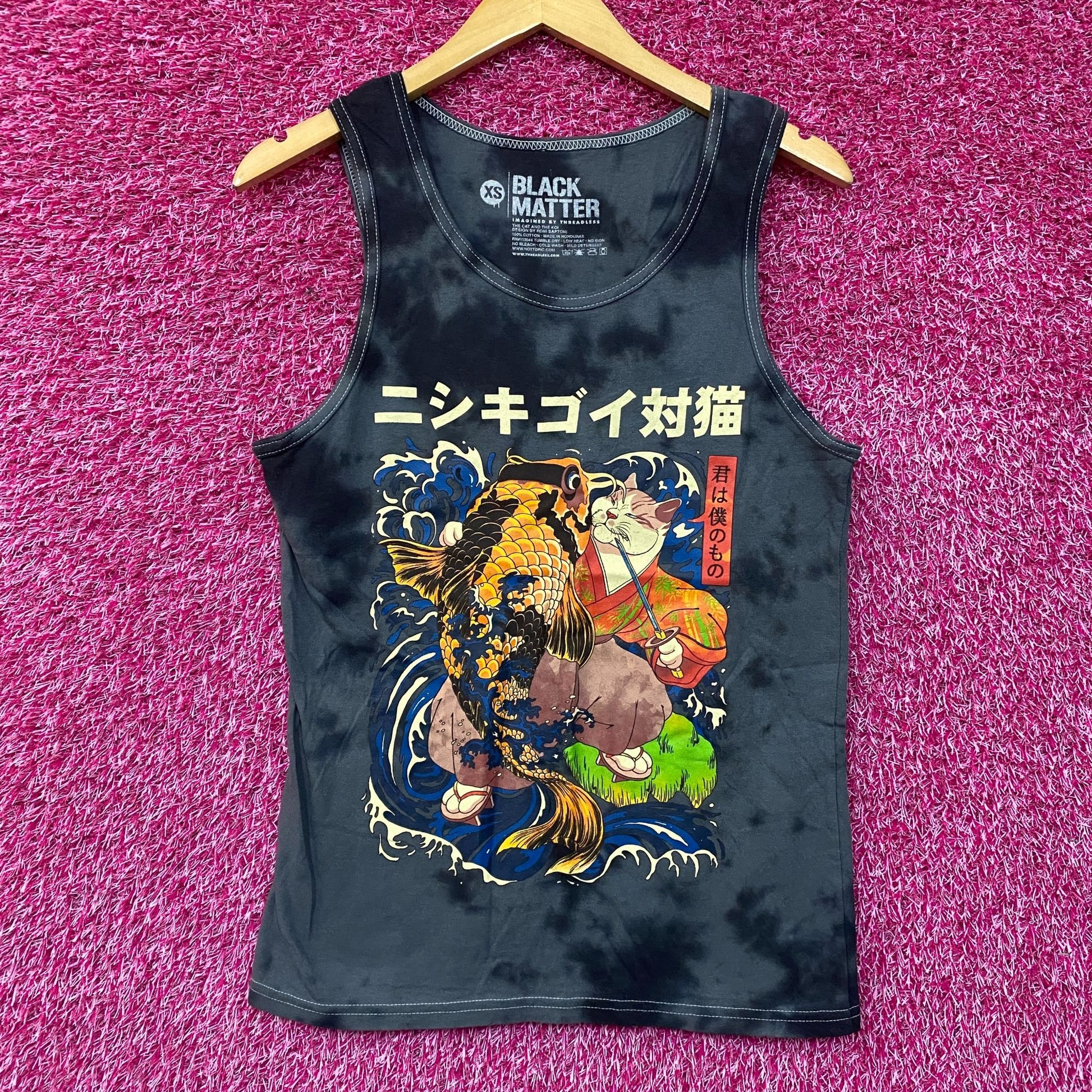 Black Matter The Cat and the Koi Graphic Design Tank Top Extra Small. Generally measures 17 inches pit to pit and 27 inches long. Amazing graphic design shirt depicting a cat in a kimono with a samurai sword fighting a koi perfect for Japanese aesthetic fans. Japanese Text on top reads " Koi Fish Vs. Cat " and on the side reads " You are Mine!" . New never worn overstock in great condition.