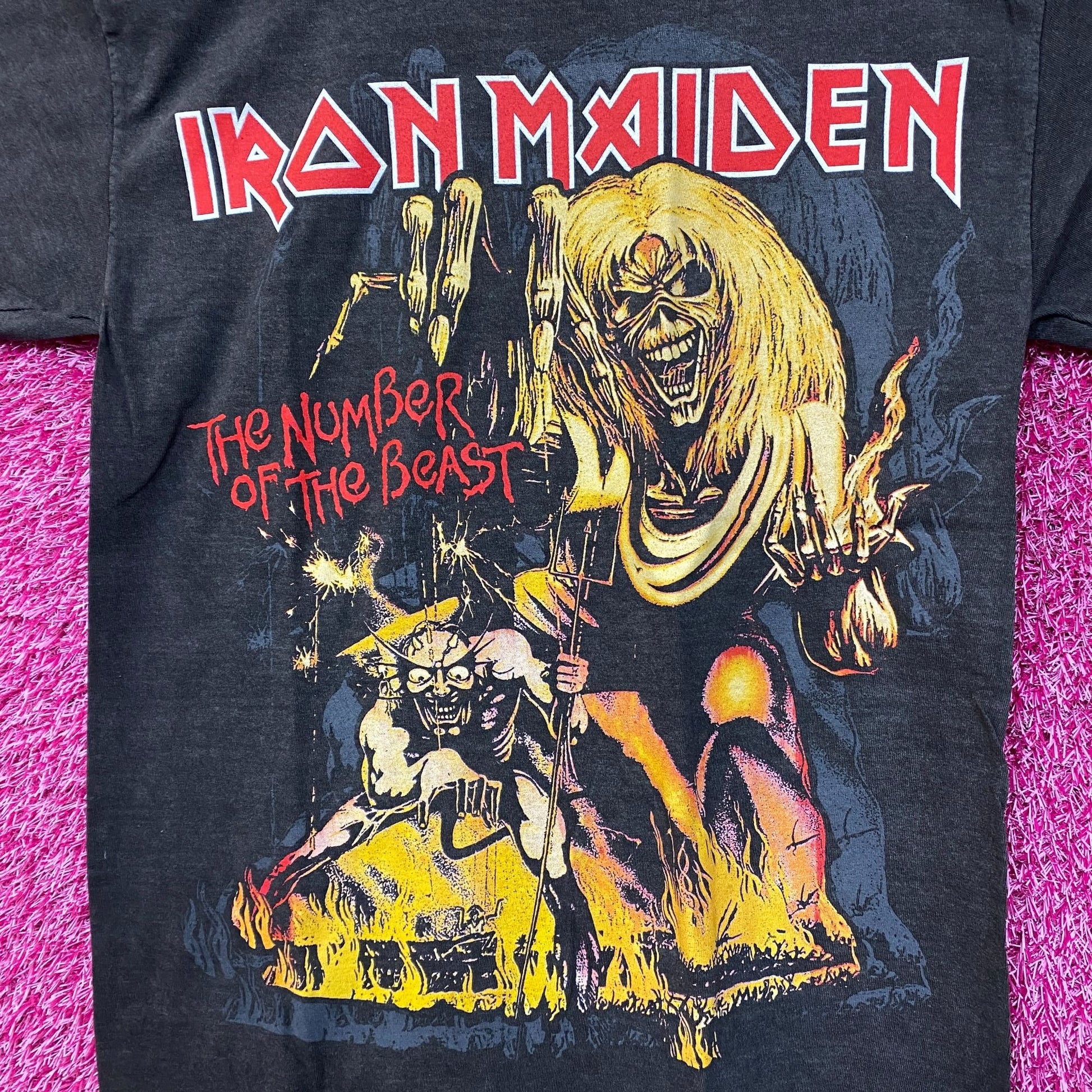 Iron Maiden The Number Of The Beast Rock Tshirt size Small generally measures 19 inches pit to pit 29 inches long amazing graphic new great condition has a mineral wash finish amazing shirt for fans of the legendary rock band Iron Maiden
