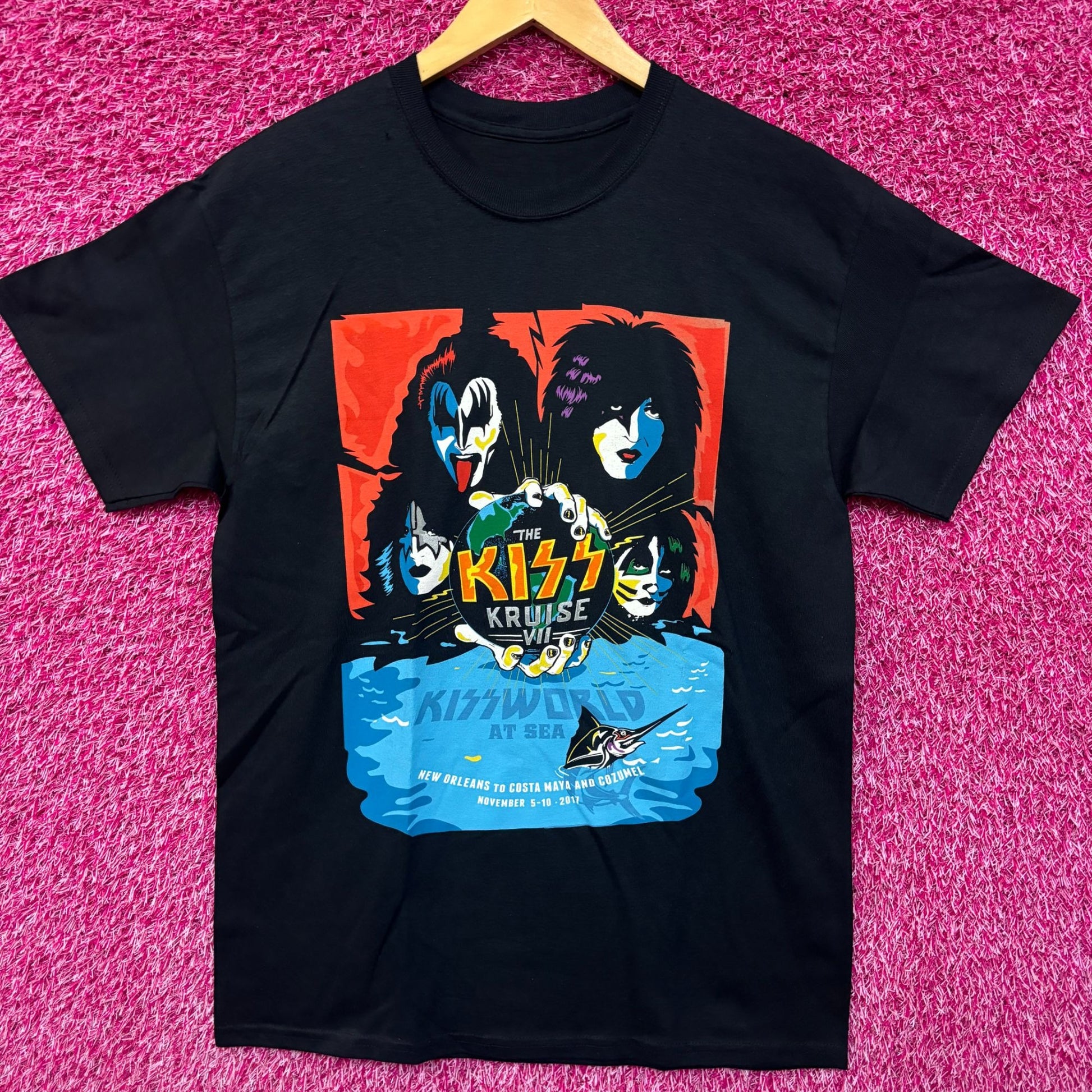 Kiss Kruise Kiss World at Sea rock tshirt Medium. generally measures 18 inches pit to pit and 28 inches long never worn first hand overstock great condition with an amazing one of a kind graphic for fans of the rock band Kiss has a hole