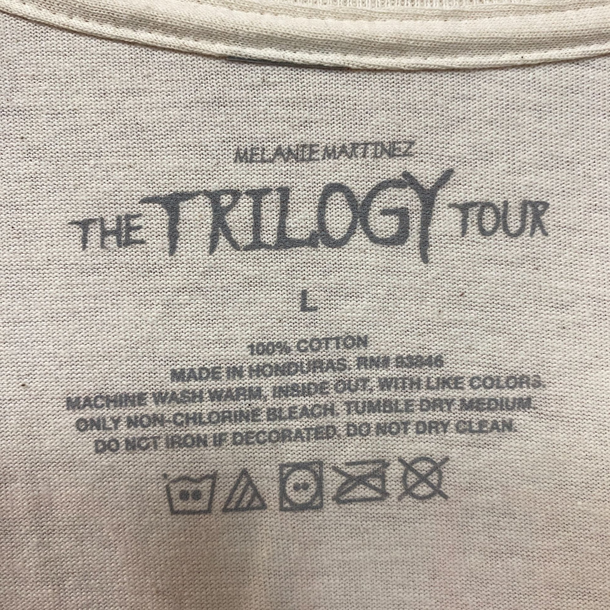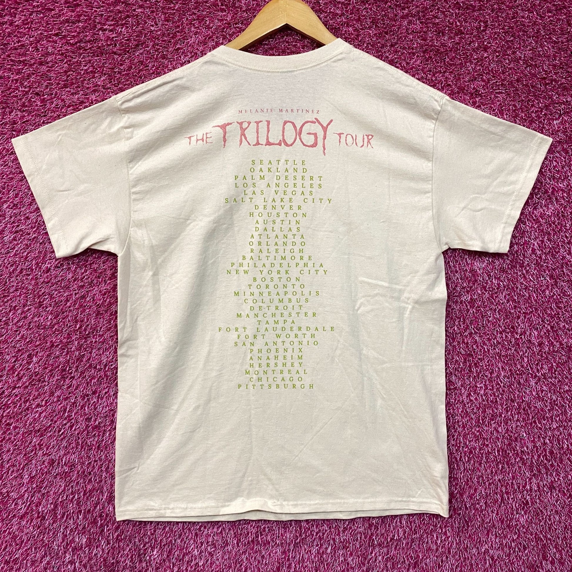 Melanie Martinez Trilogy Tour Beige Tshirt size Large Generally measures 22 inches pit to pit and 30 inches long amazing graphic on both sides of the shirt amazing tee for fans of the popular artist Melanie Martinez