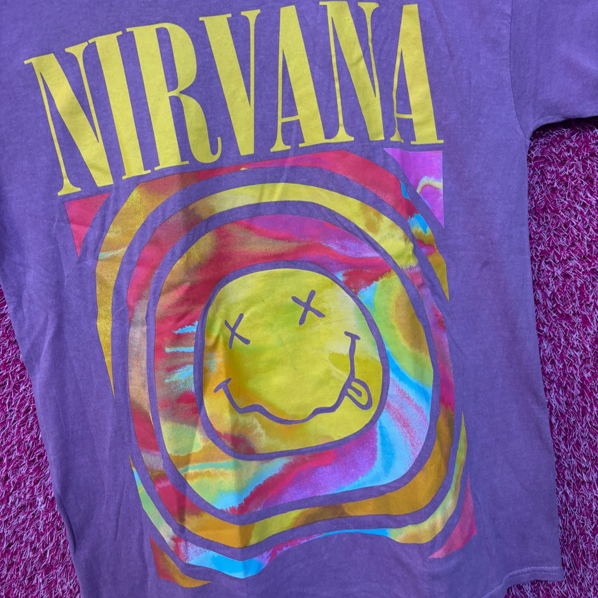 Nirvana Never Mind Smiley Face Purple Tshirt size Large generally measures 21 inches pit to pit 29 inches long has markings amazing shirt for fans of the legendary grunge rock band Nirvana amazing rock tshirt