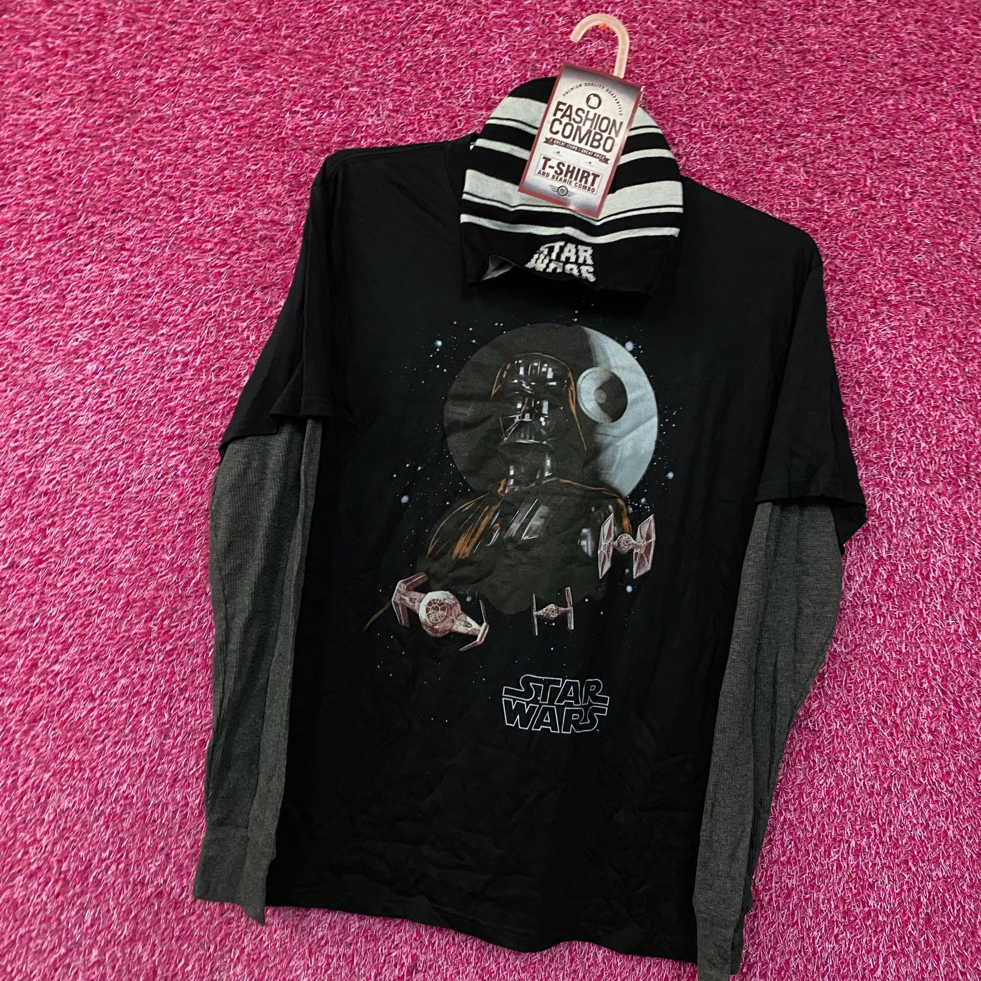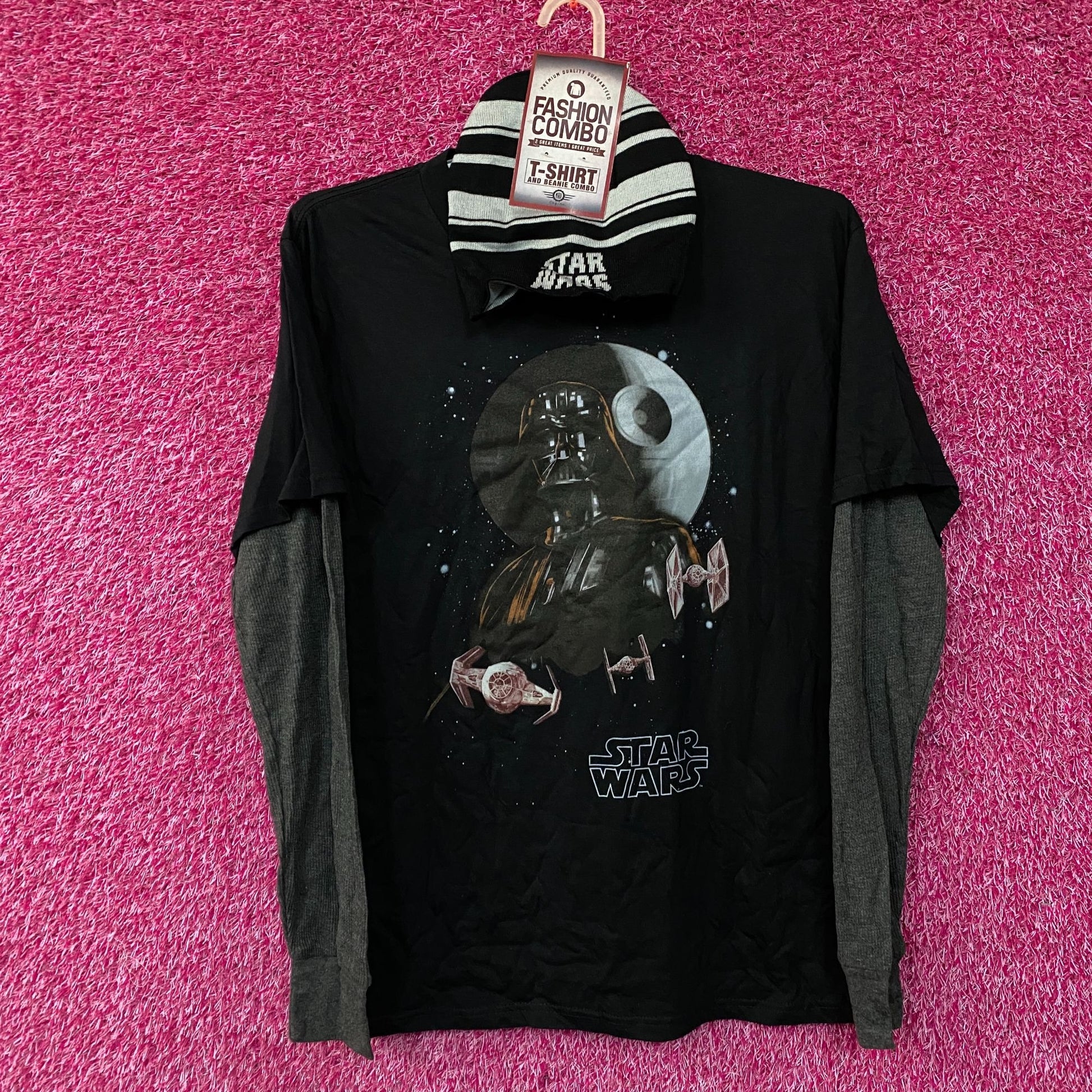 Star Wars Darth Vader Long Sleeve T-Shirt XL. Generally measures 24 inches pit to pit and 30 inches long. Amazing graphic design long sleeve shirt depicting vader and with a hoodie, perfect for Star Wars fans.